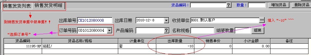2.到銷(xiāo)售發(fā)貨單據這里找到這個(gè)訂單,調出數量,在數量這里修改為“-10”。也就是說(shuō)這個(gè)客戶(hù)退貨了10套